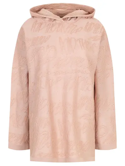 -Бежевое трикотажное худи купажированного состава от AND THE BRAND. -Модель свободного силуэта со спущенной линией плеча, длинными рукавами, капюшоном, вышивкой мелкими пайетками, которые добавляют изделию легкие блики.
