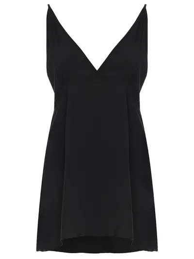 -Черный топ из легкой вискозы от MAURIZIO. -Модель свободного кроя с тонкими регулируемыми бретелями, глубоким V-образным декольте и эластичной вставкой на спине. -Топ прекрасно впишется в любой образ: от повседневного до вечернего.