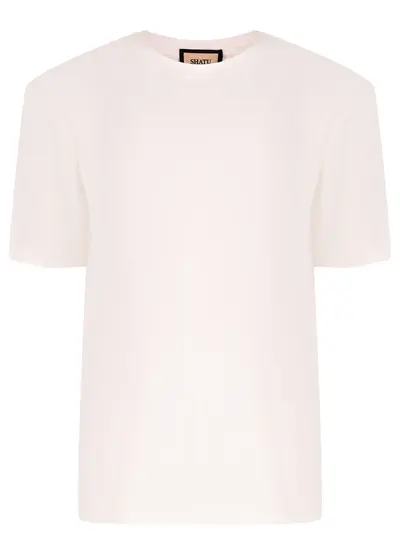 -Белая футболка из хлопка от SHATU. -Модель свободного кроя со спущенной линией плеча, короткими рукавами, круглым вырезом горловины. -Футболка дополнит повседневные образы с джинсами, шортами или брюками.