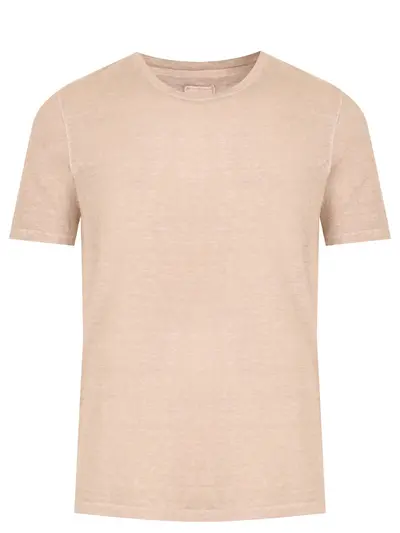 -Бежевая футболка из легкого дышащего льна от 120% LINO. -Модель прямого кроя с короткими рукавами и круглым вырезом горловины подойдет для повседневных аутфитов с джинсами, шортами или брюками.