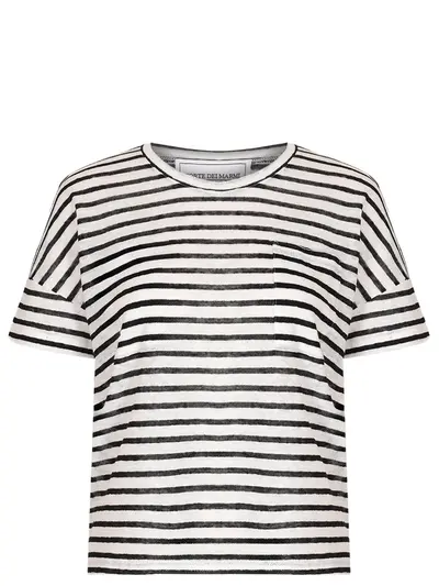 -Белая в полоску футболка из легкого дышащего льна от FORTE DEI MARMI COUTURE. -Модель свободного силуэта со спущенной линией плеча, короткими рукавами, круглым вырезом горловины и нагрудным накладным карманом.