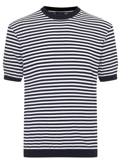 -Трикотажная футболка из хлопка в полоску от PAUL&SHARK. -Модель полуприлегающего силуэта с короткими рукавами, эластичными манжетами и поясом, круглым вырезом горловины.