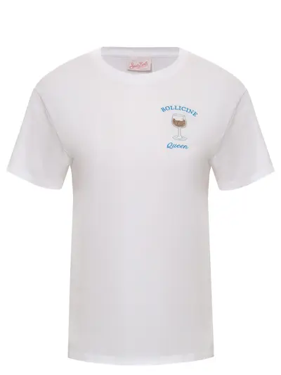 -Белая футболка из мягкого хлопка от MC2 SAINT BARTH. -Модель прямого кроя с короткими рукавами, круглым вырезом горловины и вышивкой со стразами на груди. -Футболка станет базой как для спортивных образов, так и для повседневных аутфитов с джинсами, шортами или брюками.