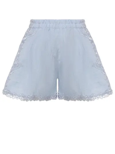-Голубые шорты из дышащего льна от MAURIZIO. -Модель свободного кроя с эластичным поясом для выбора комфортной высоты посадки и отделкой изящным кружевом по низу изделия и по бокам. -Натуральный лен обладает отличными терморегуляционными свойствами, поэтому шорты подойдут для летнего зноя.