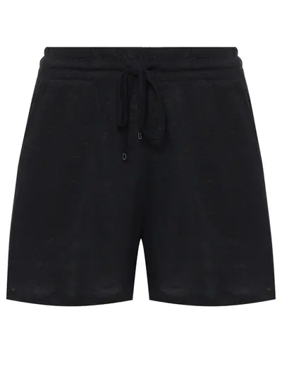 -Черные шорты из легкого дышащего льна от NOT SHY. -Модель прямого кроя с высокой посадкой, эластичным поясом на кулиске, прорезными и накладными карманами. -Шорты составят комплект с парной футболкой из коллекции бренда.