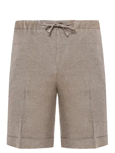 -Бежевые шорты из легкого дышащего льна от FIORONI CASHMERE. -Модель прямого кроя со стандартной посадкой, эластичным поясом на кулиске, прорезными карманами, отворотами в нижней части брючин, застежкой на молнию и пуговицу.