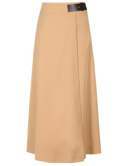 -Бежевая юбка-макси из легкого хлопка от LORENA ANTONIAZZI. -Модель трапециевидного кроя с высокой посадкой на талии, широким поясом, подолом на запах и акцентным кожаным ремнем с кобурной застежкой.