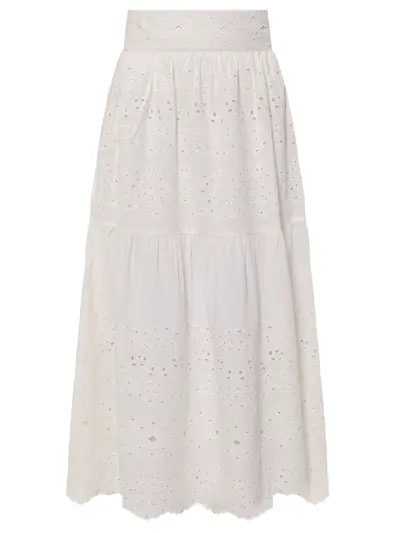 -Белая юбка из хлопкового шитья от NOT SHY. -Ярусная модель расклешенного кроя с высокой посадкой и застежкой на потайную молнию. -Юбка отлично подойдет для летнего зноя и составит идеальную пару с блузой из того же материала.
