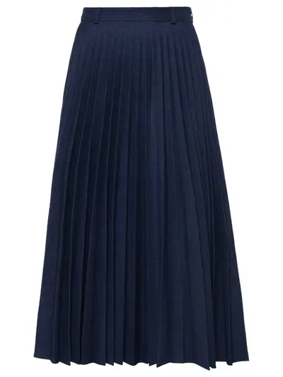 -Синяя джинсовая юбка-плиссе в длине миди от ROSEVILLE. -Расклешенная модель с высокой посадкой на талии, поясом со шлевками, застежкой на молнию. -Юбка будет органично выглядеть как с обувью на плоском ходу, так и с каблуком.
