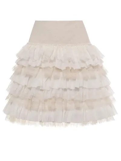 -Модель с высокой посадкой, широким поясом, ярусным декором оборками и кружевом.