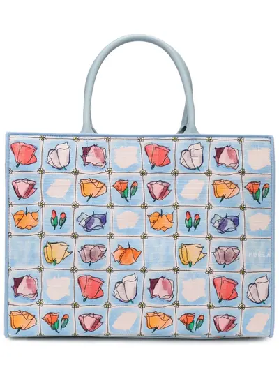 -Голубая сумка-тоут из плотного текстиля с цветочным принтом от FURLA.