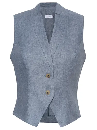 -Синий жилет из дышащего льна от BARBA. -Модель приталенного кроя с фигурным вырезом горловины и застежкой на пуговицы. -Жилет можно носить как самостоятельный элемент одежды или в качестве дополнения к многослойному образу с топом или рубашкой.