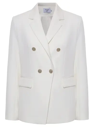-Белый двубортный жакет из костюмной ткани купажированного состава от SEVEN LAB. -Модель полуприлегающего силуэта с длинными рукавами, прорезными карманами с клапанами, лацканами и отложным воротником, застежкой на пуговицы.