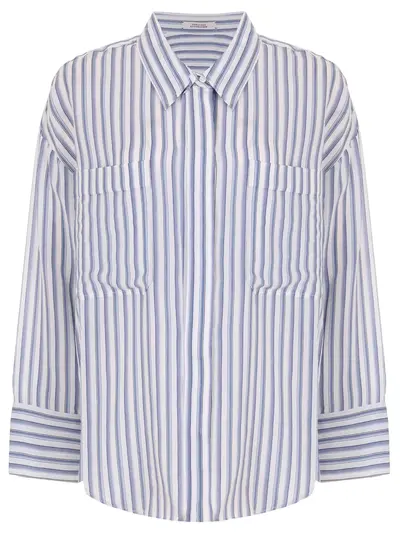 -Рубашка из смесовой вискозы в сине-белую полоску от DOROTHEE SCHUMACHER. -Модель свободного кроя со спущенной линией плеча, длинными рукавами, широкими манжетами, отложным воротником, нагрудными накладными карманами, застежкой на пуговицы.