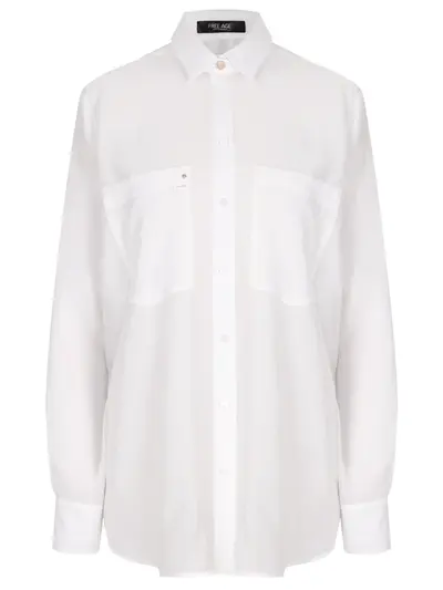-Белая полупрозрачная блуза купажированного состава от FREE AGE. -Модель свободного силуэта со спущенной линией плеча, длинными рукавами с манжетами, отложным воротником, нагрудными накладными карманами, застежкой на пуговицы.