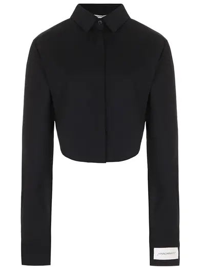 -Черная укороченная рубашка из хлопка от HINNOMINATE. -Модель свободного кроя со спущенной линией плеча, длинными рукавами с широкими манжетами, отложным воротником, закругленным подолом и супатной застежкой на пуговицы.