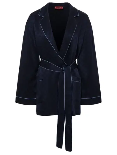 -Темно-синяя блуза купажированного состава с принтом в виде паттерна логотипа бренда от GUCCI.