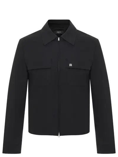 -Черная рубашка из шерсти от AMIRI. -Модель прямого кроя с длинными рукавами, манжетами, отложным воротником, нагрудными накладными карманами с клапанами, застежкой на молнию с двумя пуллерами, логотипом бренда на груди.