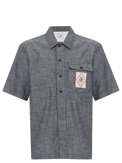 -Синяя рубашка из хлопка от C.P. COMPANY. -Модель прямого кроя с короткими рукавами, отложным воротником, нагрудным накладным карманом, нашивкой с логотипом бренда, застежкой на пуговицы.