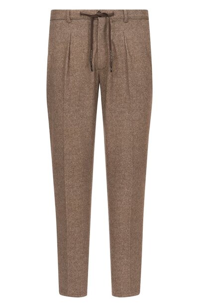 Брюки со стрелками и защипами сшили из эластичного хлопка с шевронным узором. Зауженную модель с четырьмя врезными карманами дополнили кулиской с брендированным шнуром.