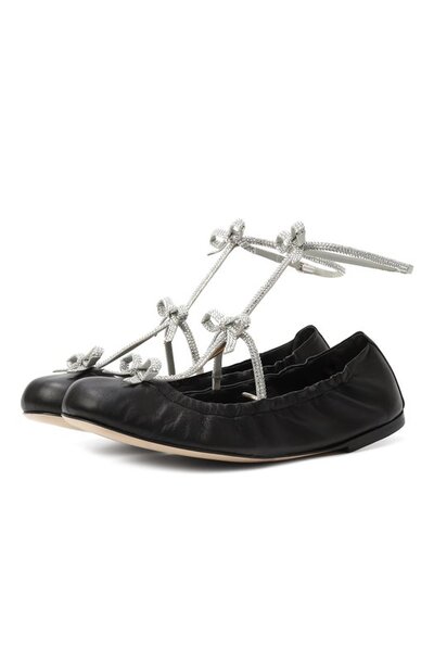 Балетки Caterina с гибкой подошвой и эластичным вырезом сшили из мягкой кожи. Туфли с круглым мысом дополнили узкими кристальными ремешками с бантами и пряжкой.