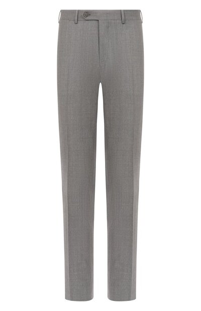 Прямые брюки со стрелками изготовили из эластичной костюмной шерсти. Модель с боковыми и задними прорезными карманами застегивается потайной молнией и смещенной вбок пуговицей.