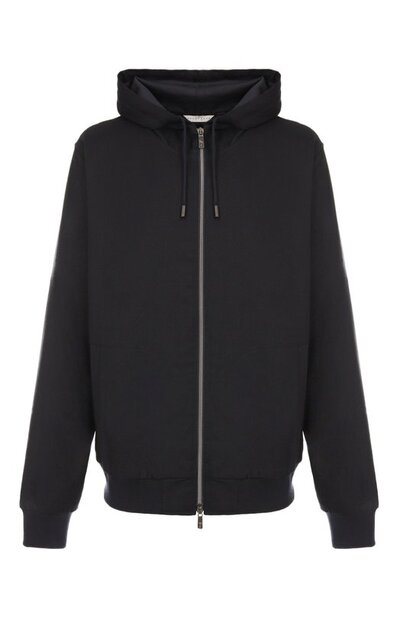 Для пошива толстовки с эластичными манжетами и поясом использовали шерсть. Модель на встречной молнии с брендированными пуллерами дополнили регулируемым капюшоном и двумя боковыми карманами.