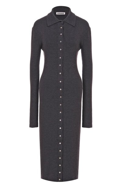 Полуприлегающее миди-платье на кнопках по всей длине органично дополнит повседневный гардероб. Для пошива модели с отложным воротником использовали меланжевый трикотаж из чистой шерсти.