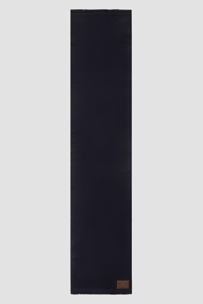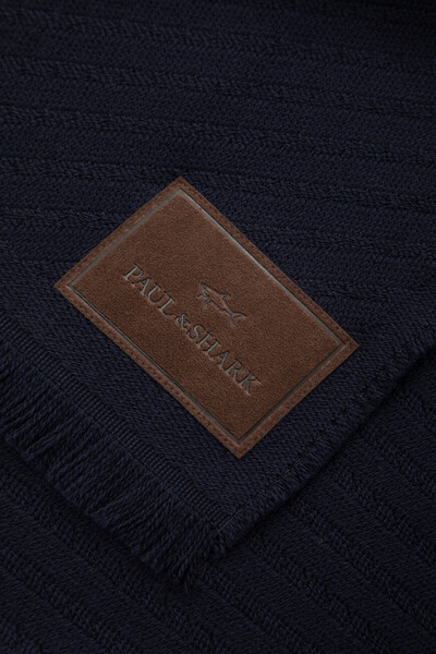Тёмно-синий шарф Paul&Shark органично дополнит повседневные и деловые образы. Прямоугольный аксессуар выполнен из мягкой чистой шерсти virgin и покрыт диагональным жаккардовым узором в виде полос в тон. Концы широкой модели подчёркнуты короткой бахромой, а один из углов - прямоугольным патчем коричневого цвета с тиснёными надписью-логотипом и фирменной эмблемой.