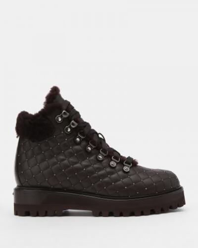 Ботинки Le Silla выполнены из натуральной кожи с ромбовидной строчкой. Модель украшена серебристой фурнитурой и заклепками по периметру. Внутри — подкладка и стелька из натурального меха, обеспечивающие теплоизоляцию и комфорт в холодную погоду. Подошва с протектором изготовлена из легкой резины и декорирована фирменным логотипом сзади.