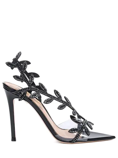 -Модель с зауженным мысом, широкой союзкой из прозрачного плексигласа, высоким каблуком-шпилькой, ремешками на подъеме и вокруг щиколоток с резными листьями.