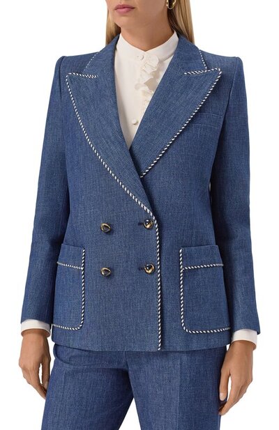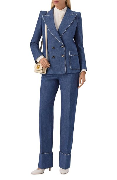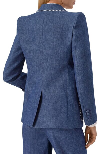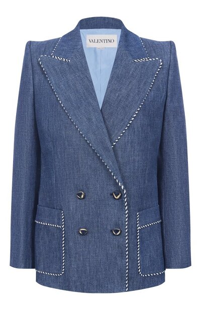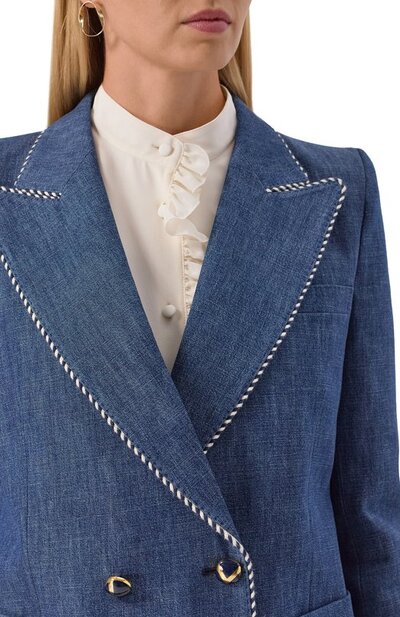 Двубортный жакет из хлопкового шамбре декорировали отделкой из двухцветного шнура. По бокам предусмотрели накладные карманы, а сзади – высокую шлицу. Модель с подкладом из крепдешина застегивается пуговицами с фирменной литерой V.