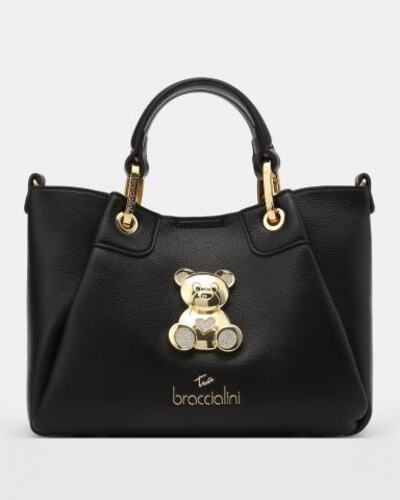 Маленькая сумка Braccialini с двумя ручками, между швами спрятаны вставки, позволяющие расширить ее объем. Изготовлена из черной искусственной кожи, выделяется золотистым медвежонком, украшенным сверкающими аппликациями, придающими дизайну свет и изысканность. Внутри — съемный клатч и регулируемый логотипированный ремень для двойного ношения.