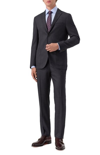 Костюм выполнили из чистой шерсти в жаккардовую клетку «принц Уэльский». Слегка приталенный пиджак дополнили двумя накладными карманами по бокам и нагрудной листочкой. На брюках со стрелками предусмотрели два боковых кармана и пару листочек сзади.