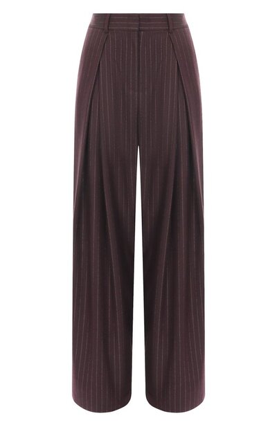 Широкие брюки с глубокими встречными складками спереди выполнили из смесовой костюмной ткани в тонкую мерцающую полоску. Модель с завышенной талией дополнили врезными карманами по бокам и парой листочек сзади.