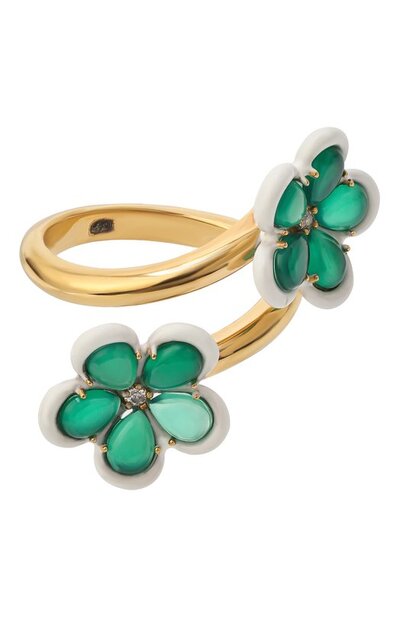 Незамкнутое кольцо выполнили из серебра 925-й пробы. В центр цветочных бутонов на концах поместили кубические цирконы, а лепестки, подчеркнутые кантом из покрытой эмалью керамики, инкрустировали агатами.