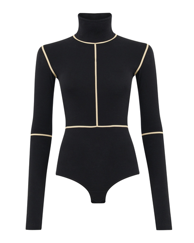 Это боди — воплощение современной элегантности и геометрической утончённости. Оно выполнено из мягкого, эластичного материала, который идеально облегает фигуру, подчёркивая её изгибы. Высокий воротник добавляет нотку изысканности и утонченности в общий силуэт. Особое внимание привлекает контрастная окантовка, подчеркивающая архитектурные линии. Она создаёт эффект графического рисунка, придавая изделию динамичность и современность. Такой дизайн позволяет сделать акцент на стройности и выразительности формы. Длинные рукава обеспечивают чувство уюта и тепла, а плотная посадка гарантирует удовольствие от носки в течение всего дня. Застёжка снизу выполнена с учётом комфорта и практичности, не нарушая общего стиля изделия. Идеально подходящее как для делового образа, так и для вечернего выхода, это боди станет неотъемлемой частью гардероба, придавая уверенности и шелковой изысканности любому ансамблю.