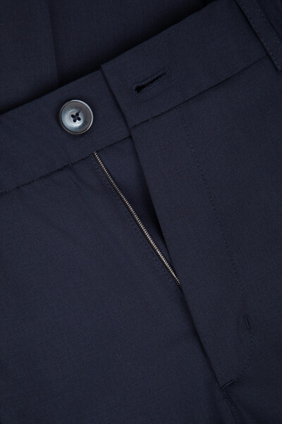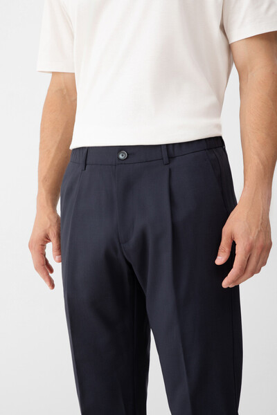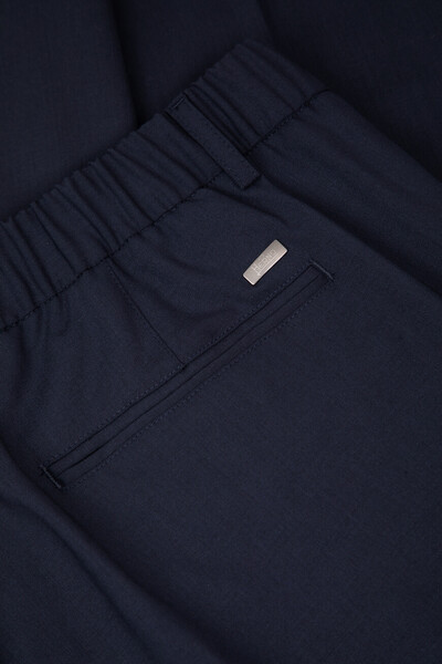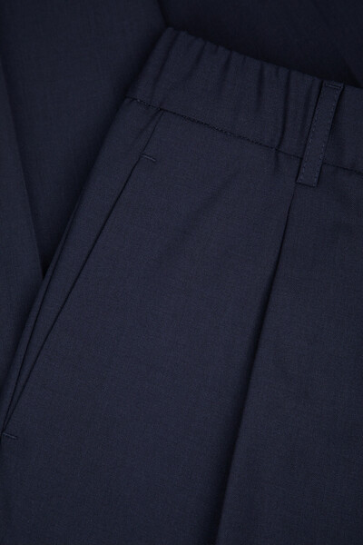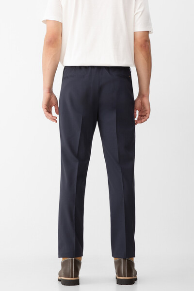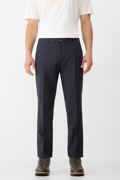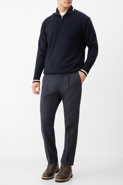 Тёмно-синие брюки с классическими стрелками и защипами сверху от HERNO. Изделие выполнено из мягкой вирджинской шерсти и дополнено плотным поясом со шлевками под ремень и эластичной вставкой в задней части. Оптимальную посадку модели прямого силуэта по фигуре также обеспечивает застёжка на молнию, покрытую планкой, и крупную пуговицу. Атрибутом Дома является прямоугольный лейбл с гравировкой, размещённый над правым задним карманом.