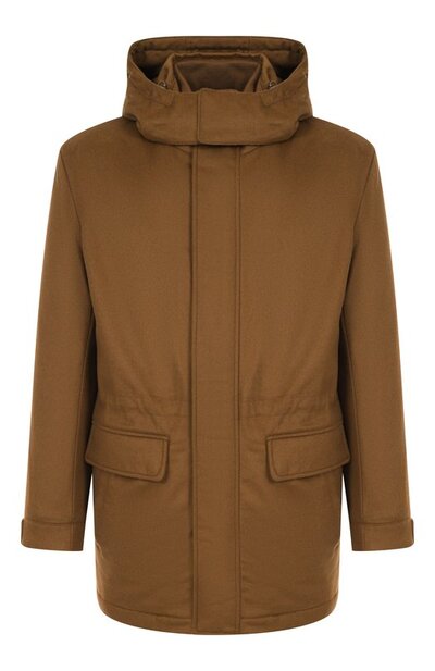 Для создания парки с воротником-стойкой и боковыми карманами с клапанами использовали плотную шерстяную ткань с добавлением кашемира. Модель с регулируемыми патами на манжетах и потайным поясом-кулиской дополнили съемным капюшоном. В утепленной тинсулейтом куртке будет комфортно при температуре до -10°C.