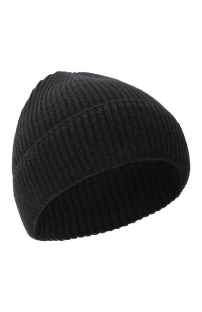Шапку бини связали эластичным узором в рубчик из шерстяной пряжи с добавлением кашемира. Широкий отворот аксессуара декорировали кожаным патчем с тисненым логотипом.