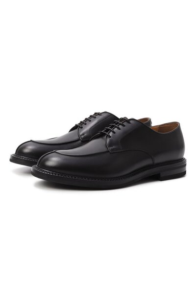 Дерби с рельефными швами на мысе выполнили из гладкой кожи. Пару установили на гибкую резиновую подошву с прошитым рантом.