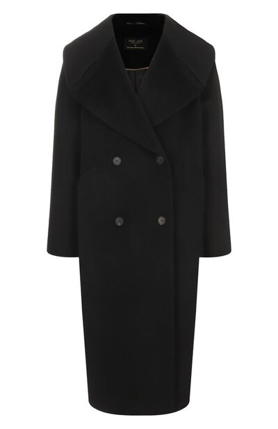 Двубортное пальто с утрированно широкими воротником и лацканами выполнили из шерстяной ткани с добавлением кашемира. Модель с рукавами реглан дополнили боковыми карманами.