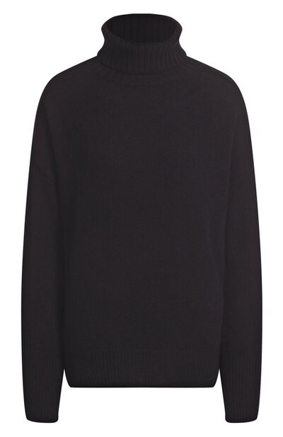 Свитер со спущенной линией плеч связан из кашемировой пряжи. Однотонная модель с высоким воротником, манжетами и поясом в рубчик удачно дополнит базовый гардероб.