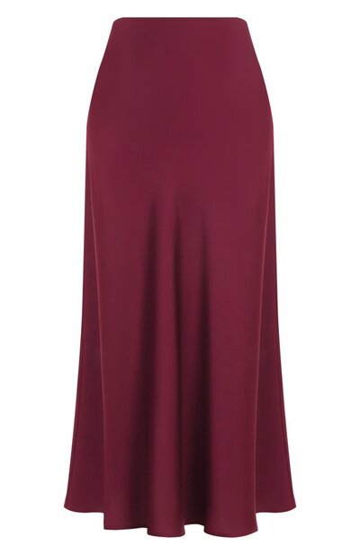 Однотонная миди-юбка А-силуэта выполнена из струящегося шелкового атласа. Эластичная модель без декора застегивается потайной молнией сбоку.