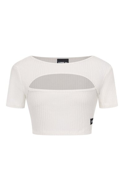 Укороченную футболку в рубчик выполнили из вискозного трикотажа с добавлением полиэстера и полиамида. Модель с вырезом спереди украсили контрастным брендированным патчем.