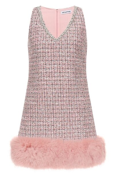 Мини-платье с потайной молнией на спинке выполнили из клетчатой буклированной ткани с добавлением шерсти и металлизированных нитей. Подол модели с кристаллической цепочкой вдоль глубокого V-образного выреза дополнили съемной отделкой из искусственного меха.