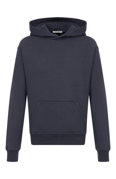 Для изготовления худи с немного спущенной линией плеч использовали хлопковый трикотаж с добавлением полиэстера. Модель с карманом «кенгуру» украсили логотипом сбоку.