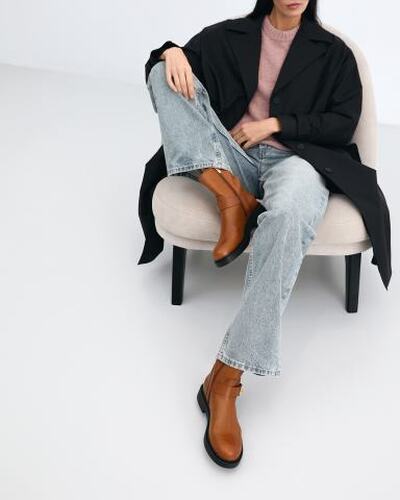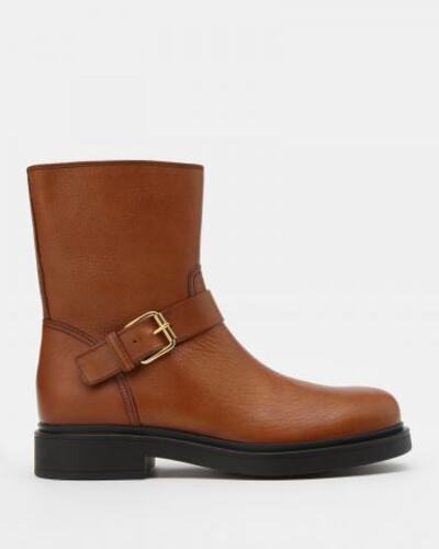 Ботинки AGL выполнены из зернистой кожи. Внутренняя подкладка из текстиля обеспечивает воздухопроницаемость и комфорт, а мягкая стелька из натурального меха сохраняет тепло. Модель застегивается на боковую молнию. Спереди пара дополнена декоративным ремешком с золотистой пряжкой. Контрастная подошва изготовлена из прочной резины.