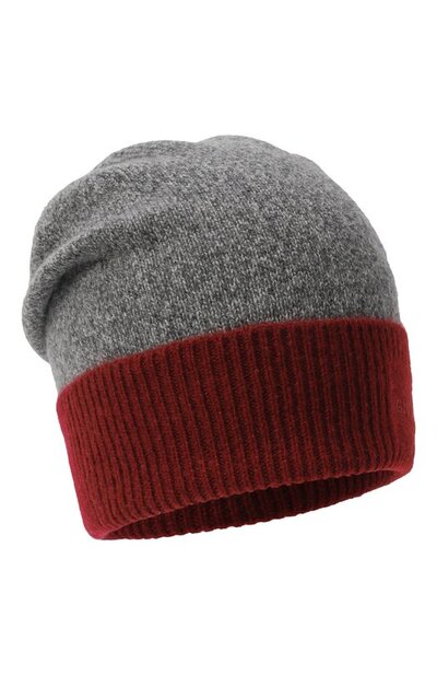 Шапку с вышитым логотипом выполнили из кашемира. Связанный гладью аксессуар дополнили широким контрастным отворотом в рубчик.