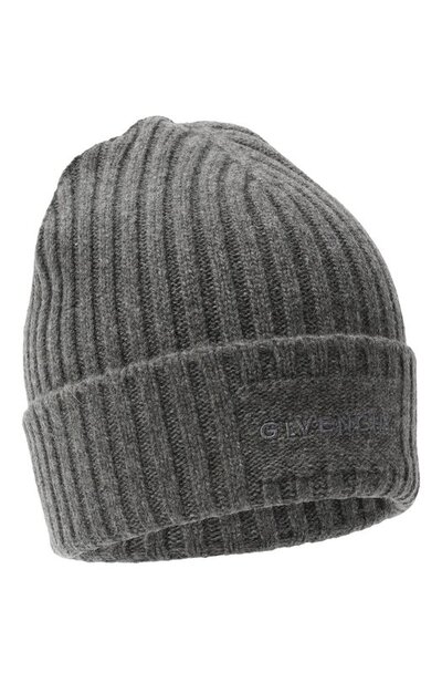 Шапку бини в рубчик выполнили из меланжевой шерстяной пряжи с добавлением кашемира. Широкий отворот аксессуара украсили вышитым логотипом бренда.